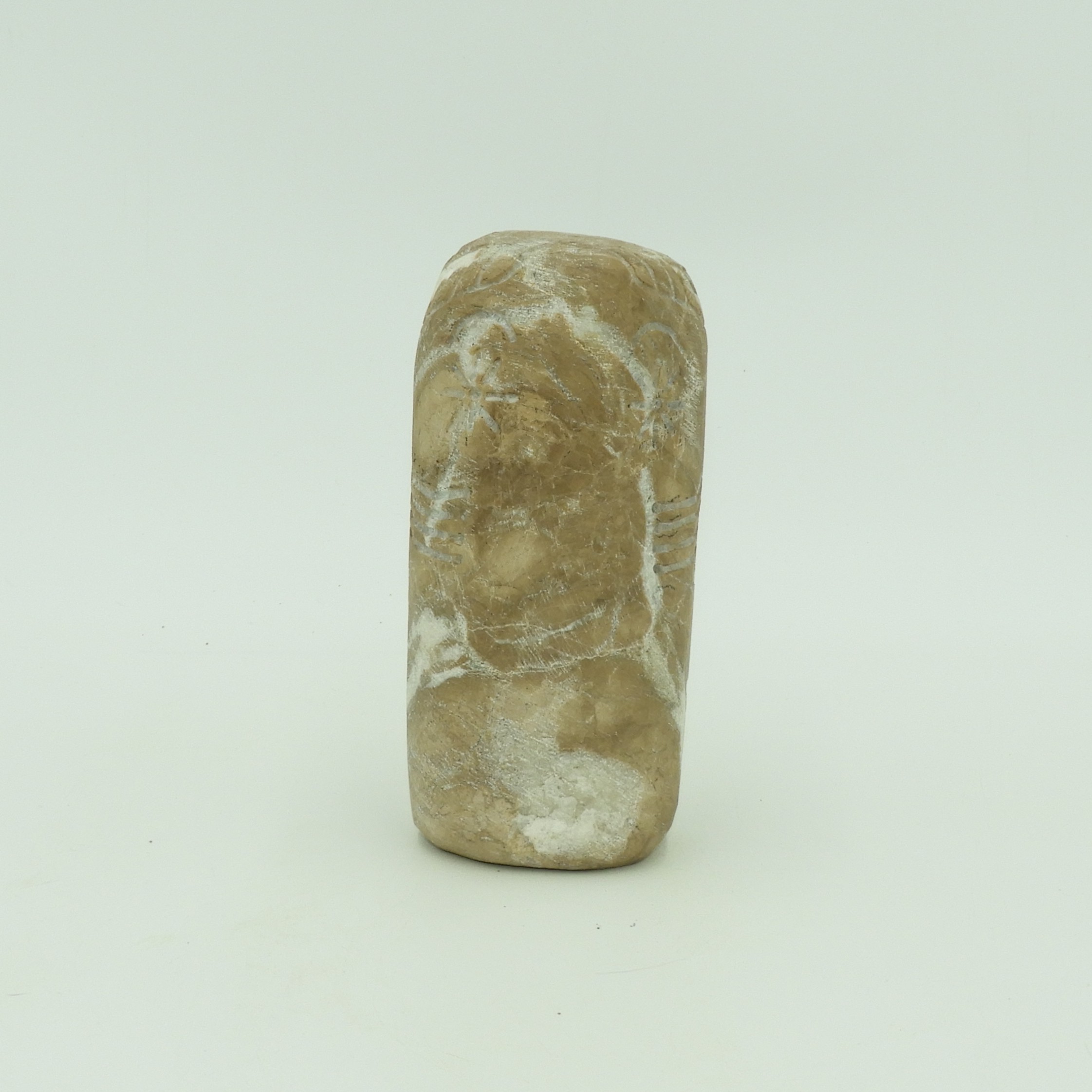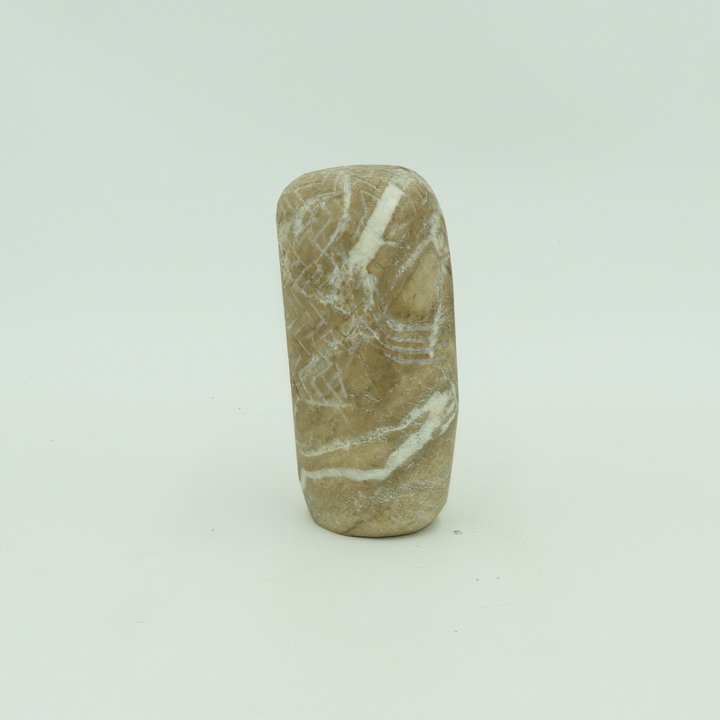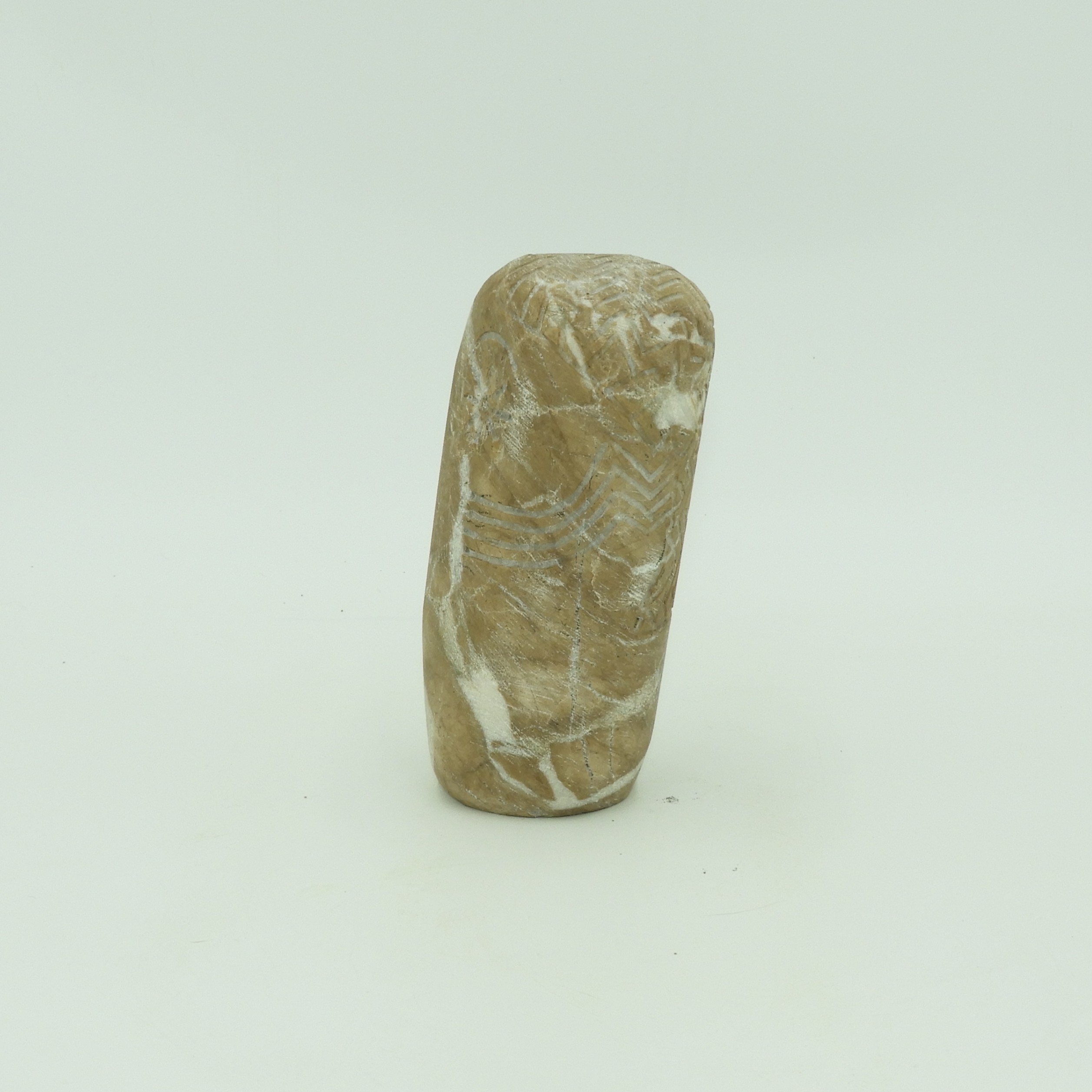 Ídolo Cilíndrico Oculado del Cerro de las Vacas (Trebujena-Lebrija, Cádiz), hecho y grabado a mano en Piedra Natural, Mármol Marrón Emperador. Es una escultura de tamaño mediano.